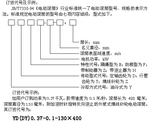 (2).用戶訂購逆止電動滾筒時(shí),須注明旋轉(zhuǎn)方向,如不注明則為任意方向。其表示方法為在特性代號后加“S”(表示在電機(jī)引出線一側(cè)觀察,端蓋應(yīng)順時(shí)針旋轉(zhuǎn))或“N”(表示在電機(jī)引出線一側(cè)觀察,端蓋應(yīng)逆時(shí)針旋轉(zhuǎn))。