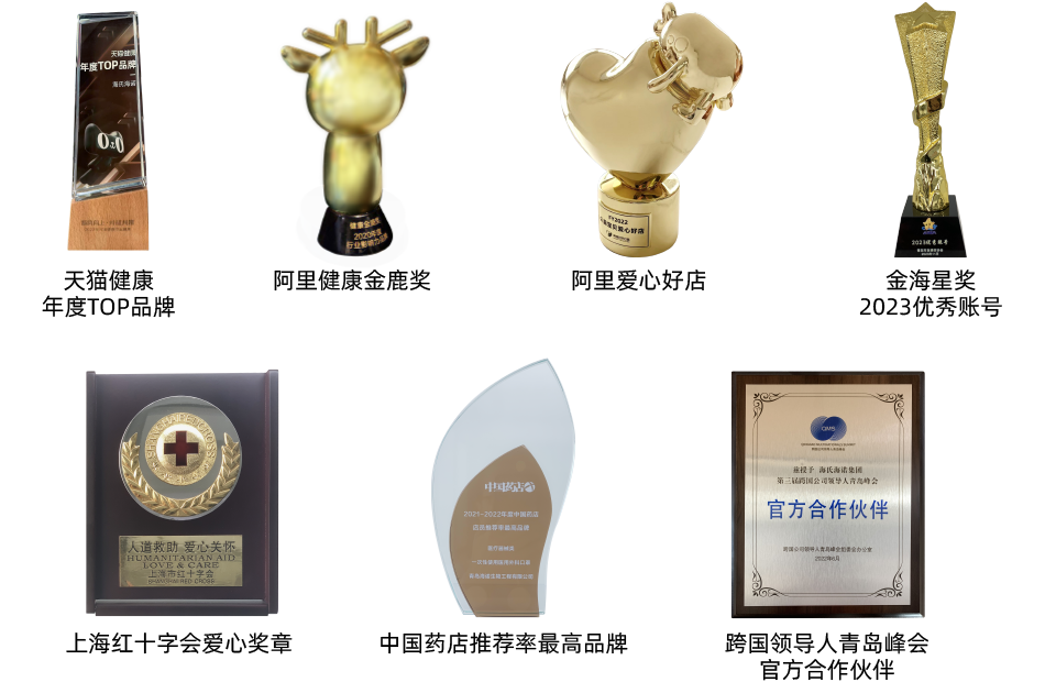 海氏海諾集團先后獲得青島市守合同重信用企業、青島市優秀民營企業、中國醫用敷料行業杰出品牌、中國優秀民營企業、中國醫療器械行業最具創新活力競爭力前三強企業、中國馳名商標、山東省高端品牌培育企業、山東省“品質魯藥”建設示范企業、國家級“專精特新”小巨人等榮譽和獎項。