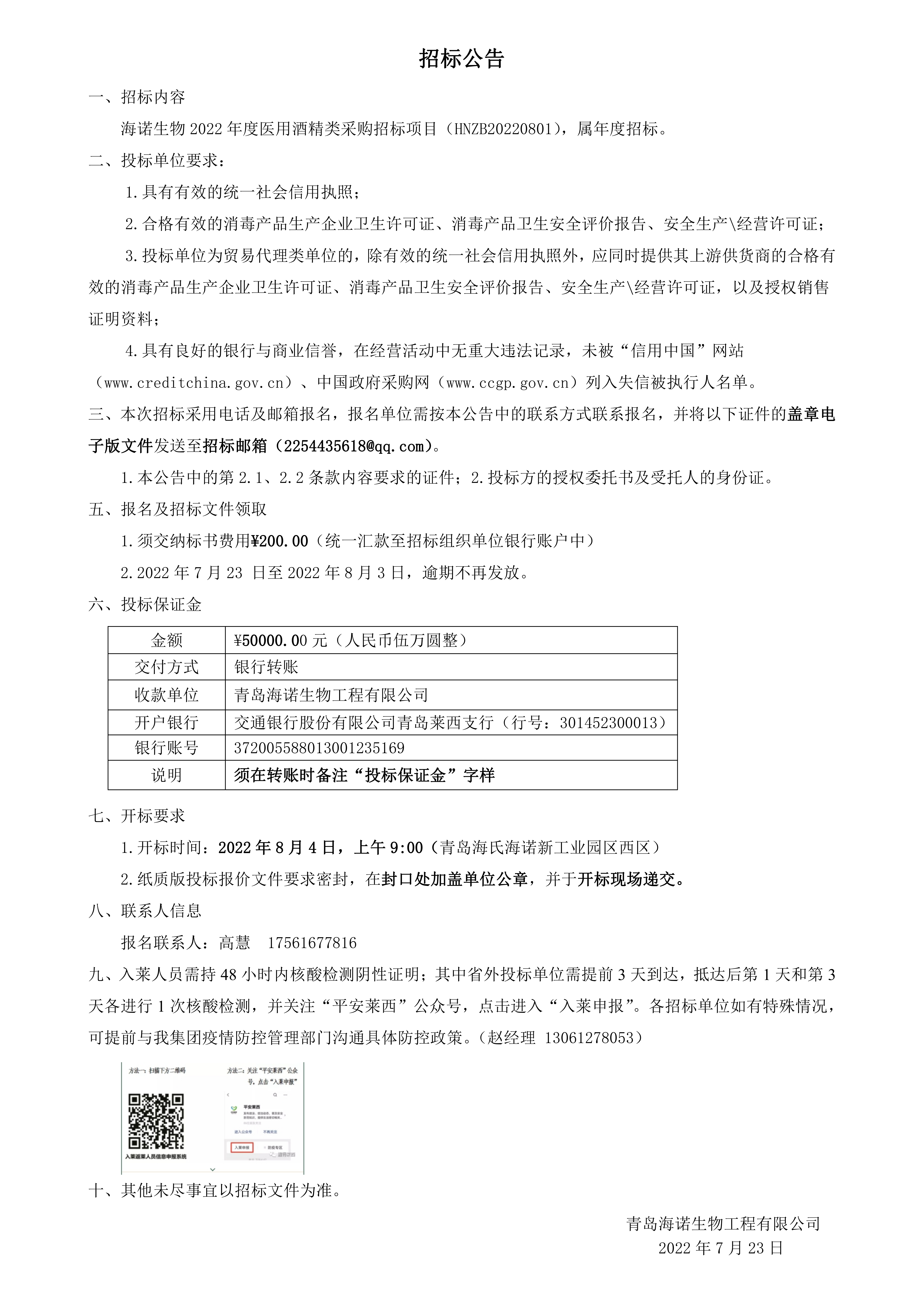 2022年度海氏海諾集團酒精類采購招標正式開始,屆時我們將秉承公正、公平、公開、透明的招標原則,期待優秀供應商的廣泛參與。具體招標細節如下: