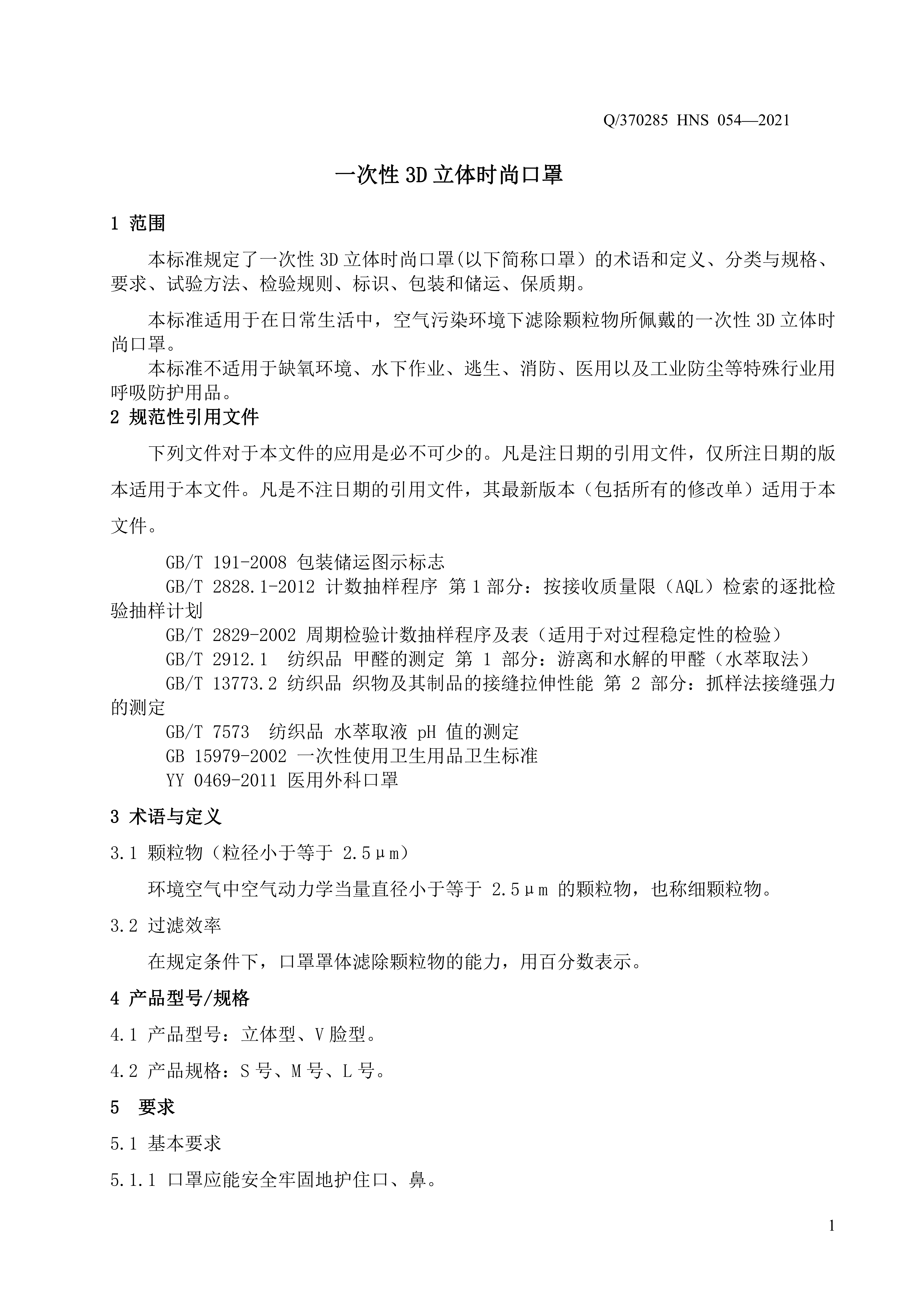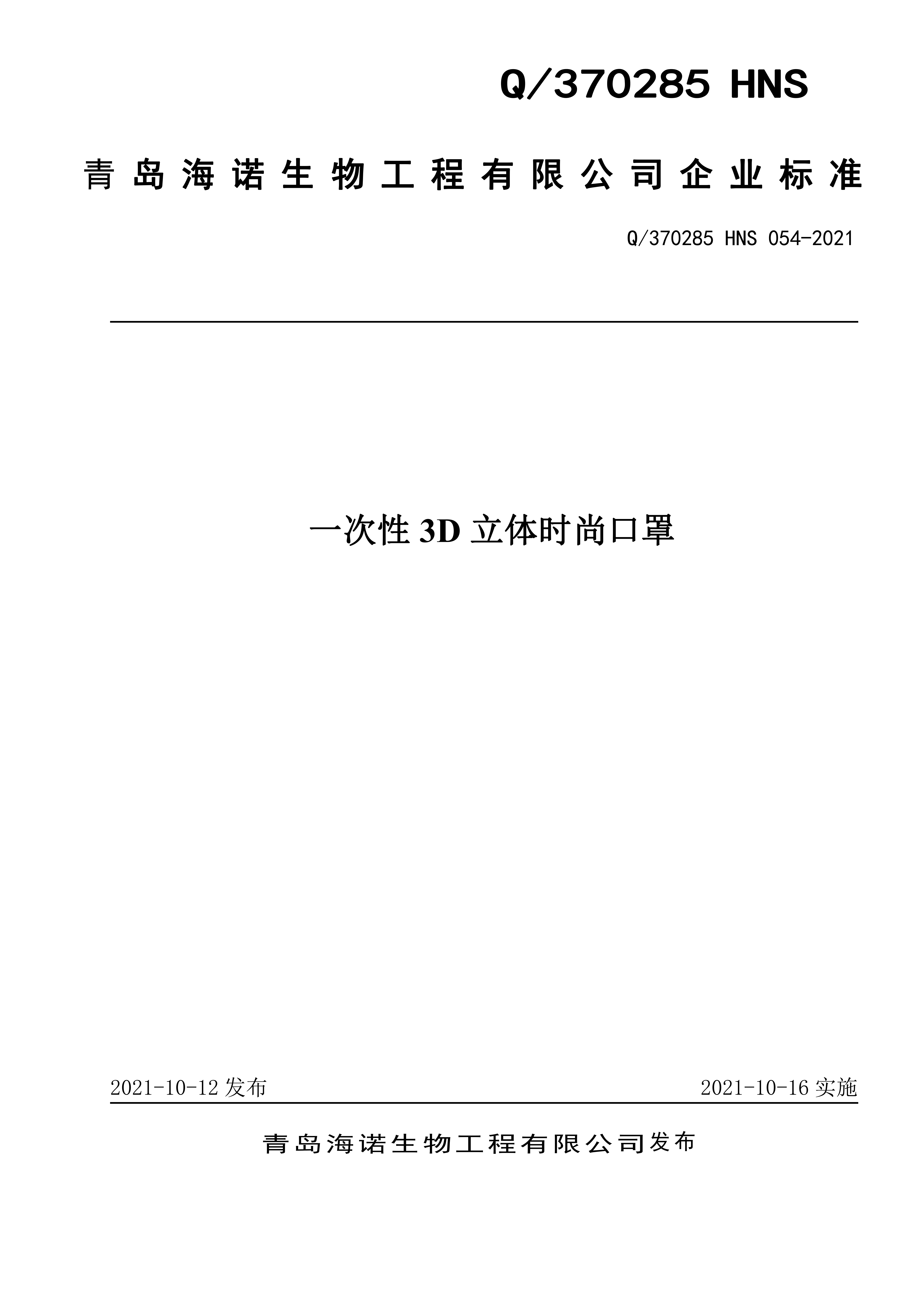 青島海諾生物工程有限公司企業(yè)標(biāo)準(zhǔn) — 一次性 3D 立體時(shí)尚口罩