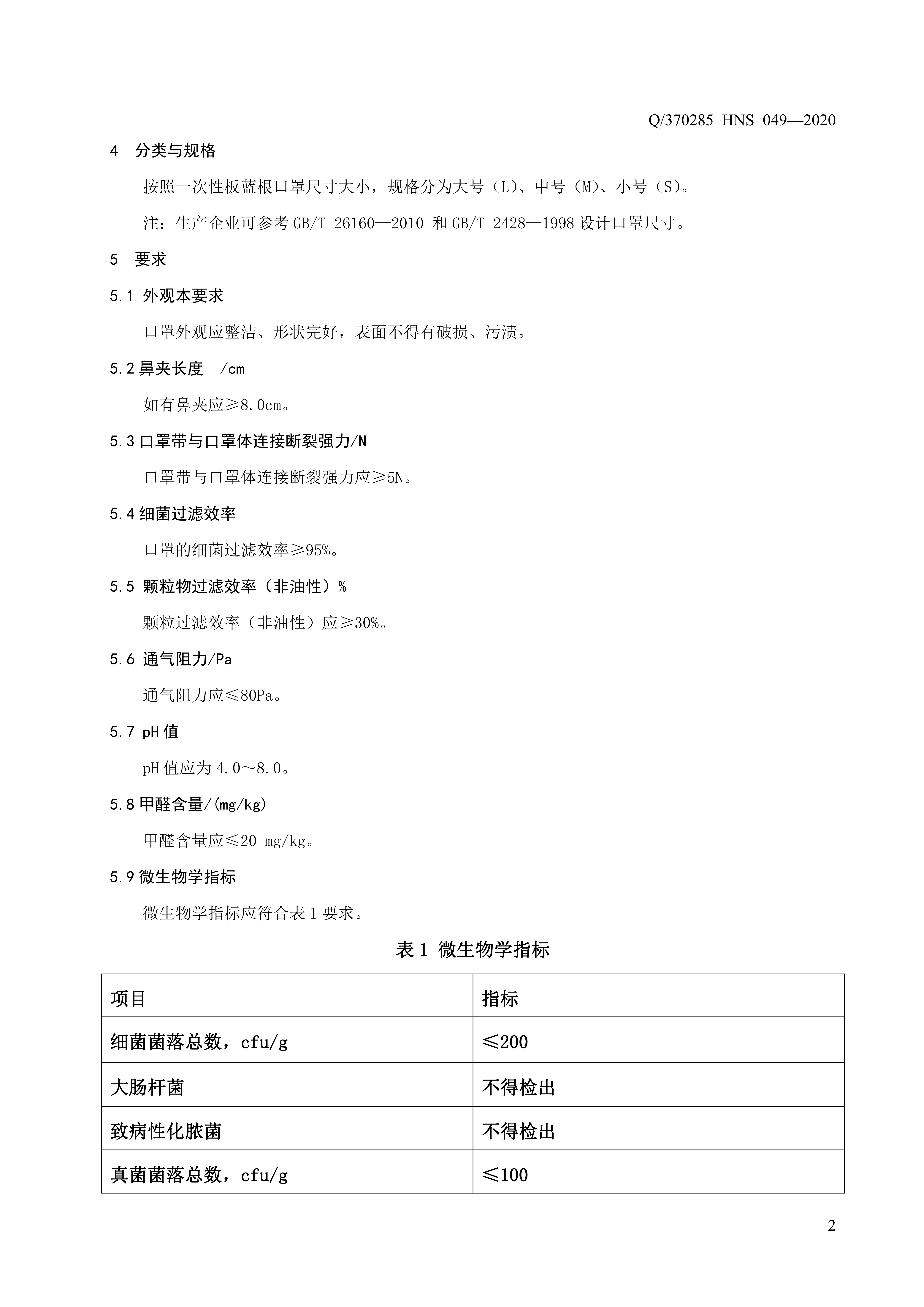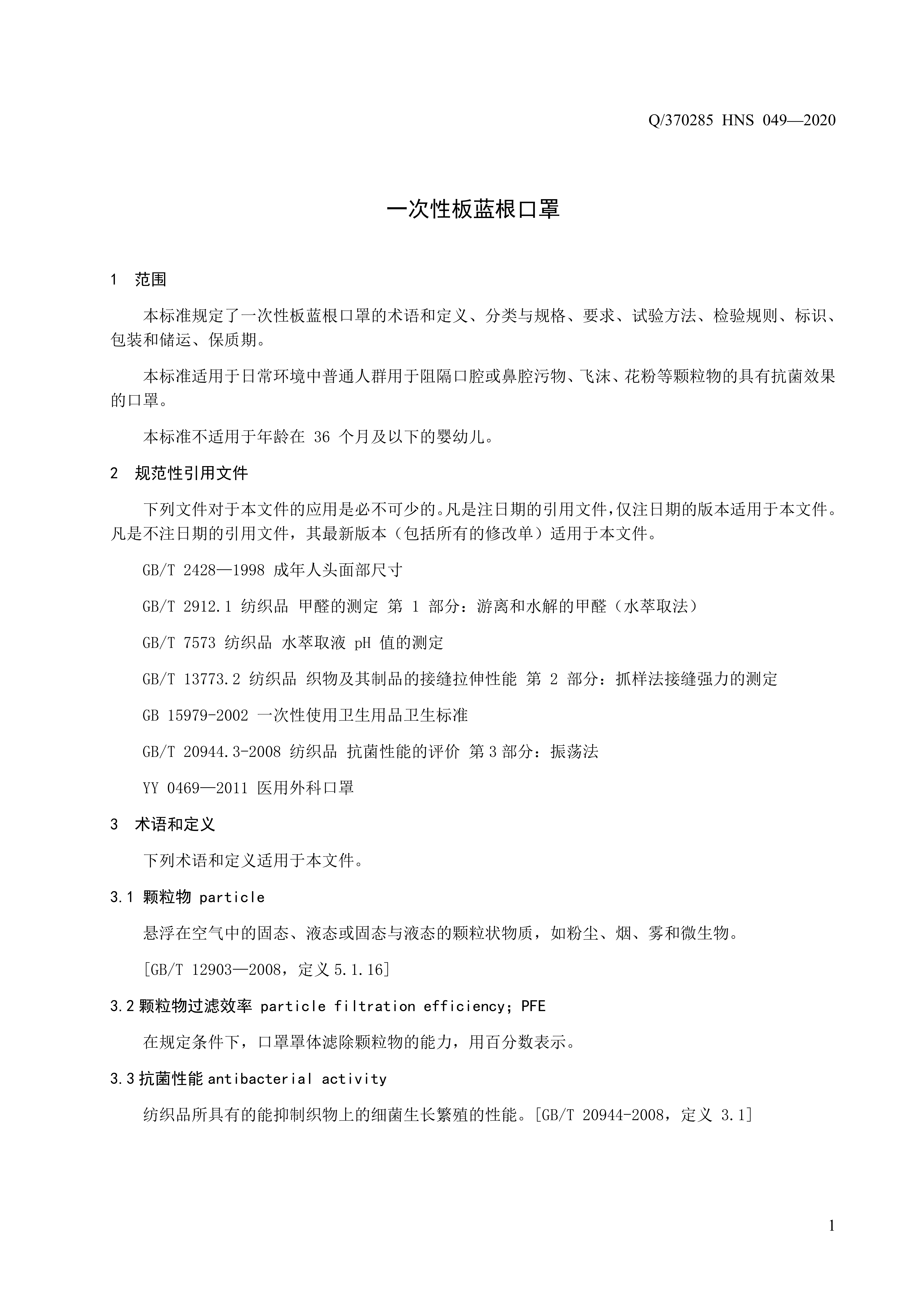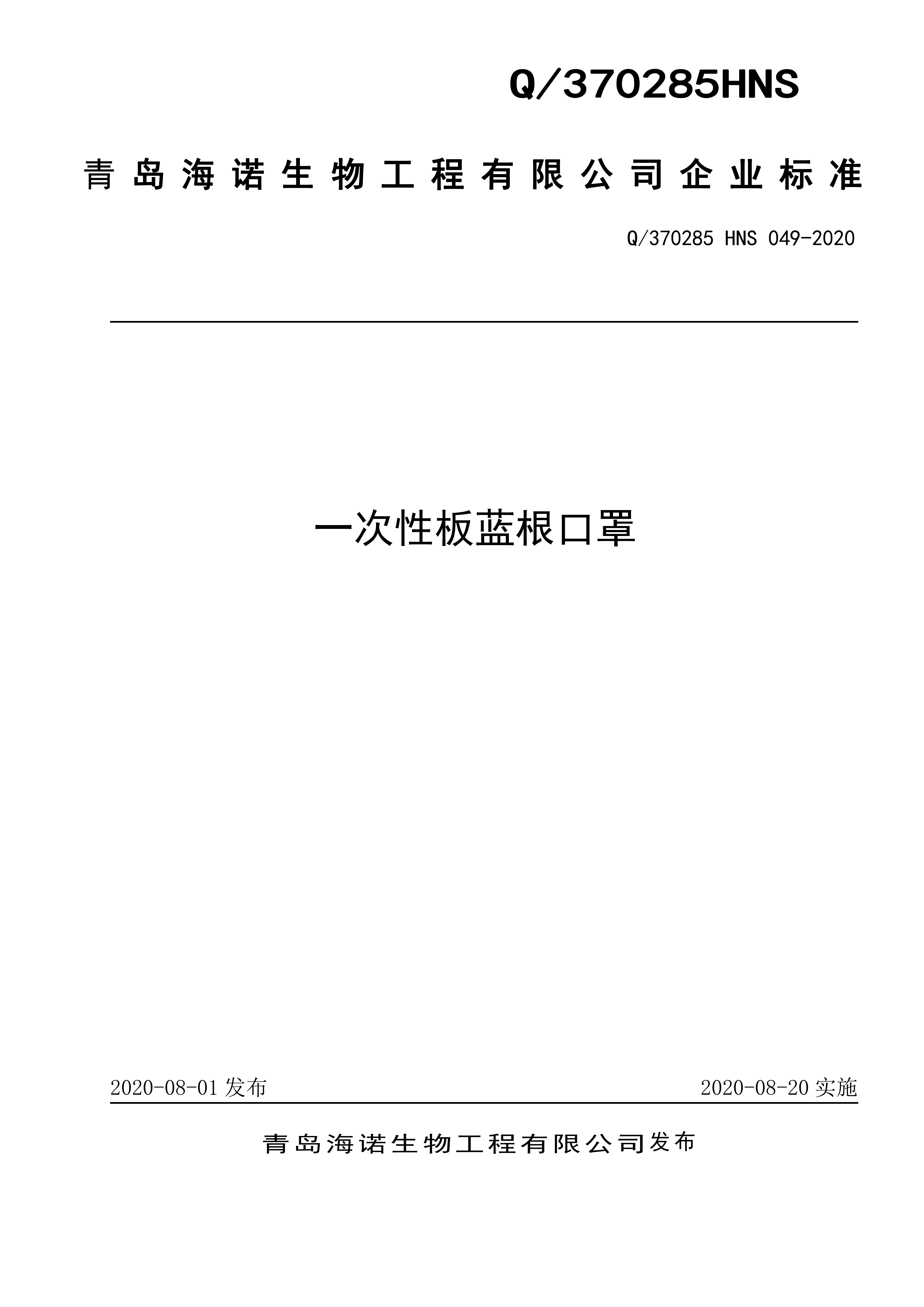 青島海諾生物工程有限公司企業(yè)標(biāo)準(zhǔn) — 一次性板藍(lán)根口罩