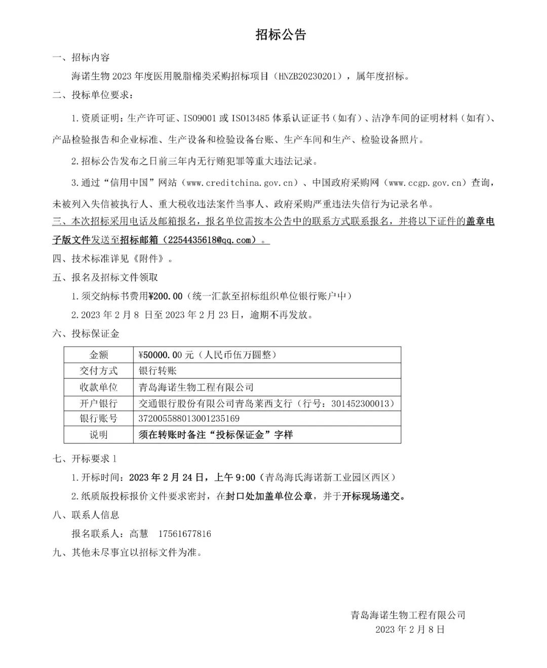 海諾生物 2023 年度醫用脫脂棉類采購招標項目現已正式開始,屆時我們將秉承公正、公平、公開、透明的招標原則,期待優秀供應商的廣泛參與。具體招標細節如下: