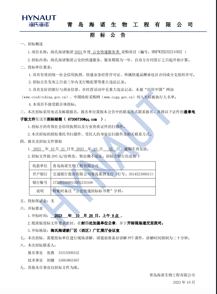 《海氏海諾集團(tuán)2023云倉快遞服務(wù)類采購項(xiàng)目招標(biāo)公告》
