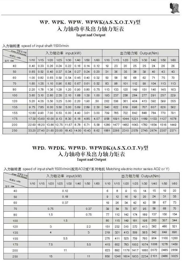 WP.WPK,WPW,WPWK(A,S,X,O,T,V)型入力軸功率及出力軸力矩表WPD.WPDK,WPDW,WPDWK(A,S,X,O,T,V)型入力軸功率及出力軸力矩表
