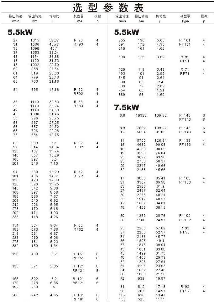 選型參數表5.5kW(續)和7.5kW